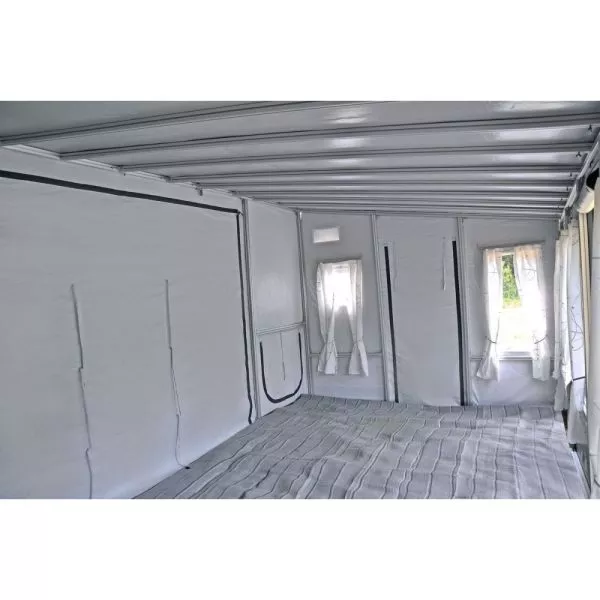 der Wohnwagen wird über einen Schleusenstreifen mit dem Zelt verbunden, zwei verschieden Abstände sind möglich